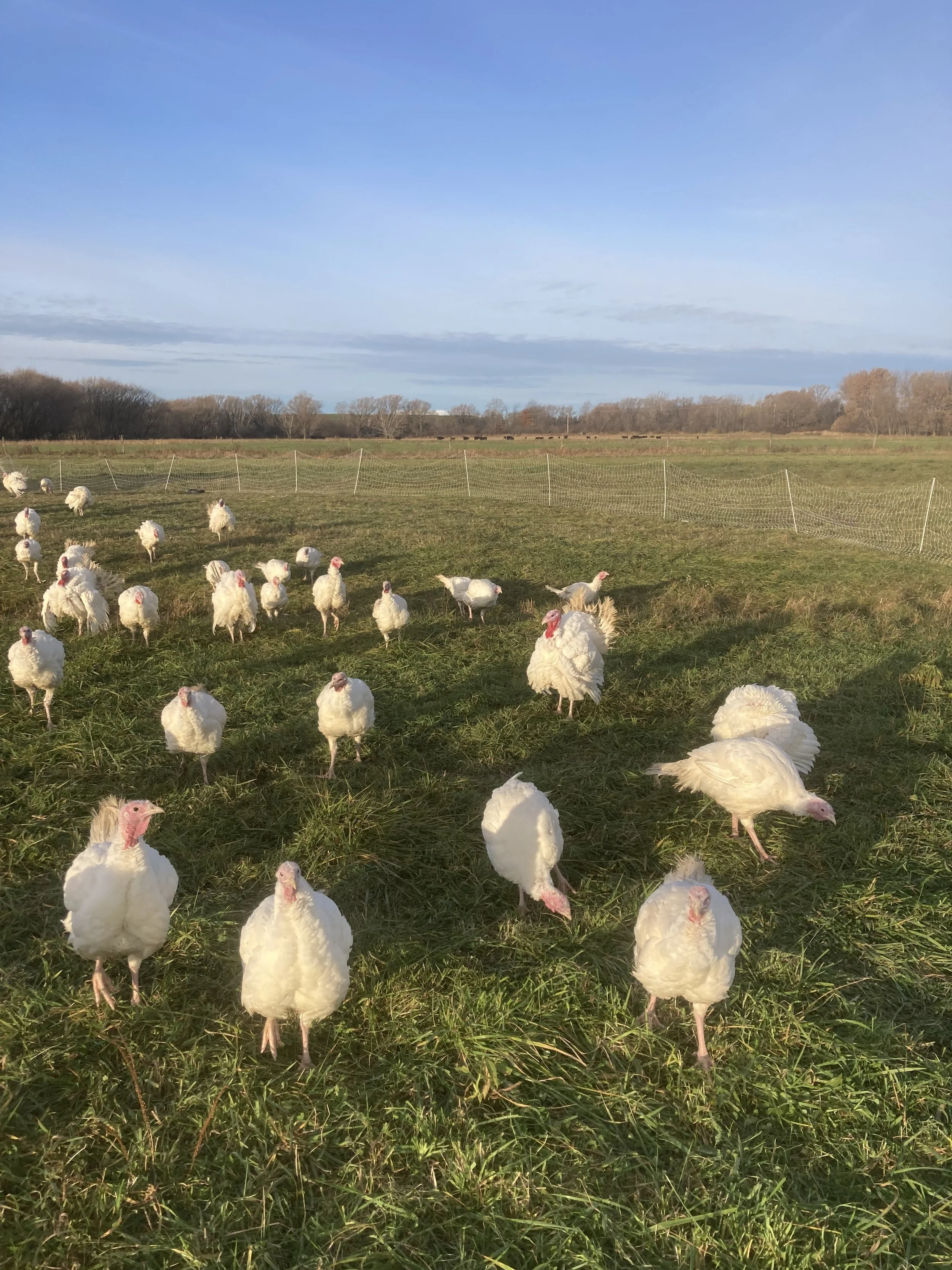 We raise 100% grass fed beef, as well as pastured chicken and turkey fed organic no soy grain. Our cattle consist of English breeds which include Black Angus, Red Angus, Hereford and Red Devon. These breeds excel in efficient conversion of forage to well marbled meat. We are 100% grass fed from birth to finish. Our pastures and hay fields are a diverse mix of grasses, legumes, and forbs with some wooded areas in the pasture. We also sell chicken throughout the summer and turkey is available for a fresh Thanksgiving dinner. None of our meat is from animals that ever received any added hormones or antibiotics. We do not use any pesticides or herbicides.